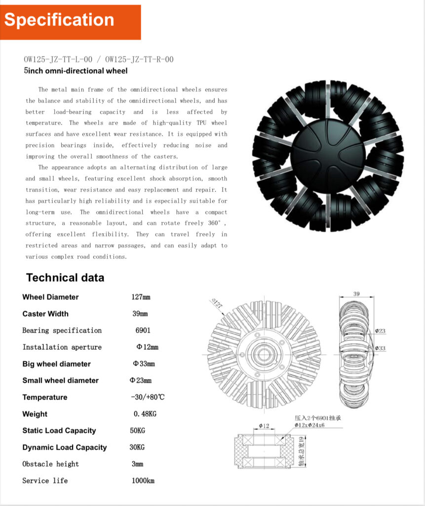 The appearance of the wheel adopts the alternating distribution of large and small wheels,with excellent shock absorption, smooth excessive, wear and easy to replace and repair, with a particularly high reliability, especially suitable for long-term use.Omnidirectional wheels are compact in structure, reasonable in layout, and can rotate 360° freely, with excellent flexibility, which can be perfectly driven in restricted areas and narrow channels, and can easily adapt to a variety of complex road.